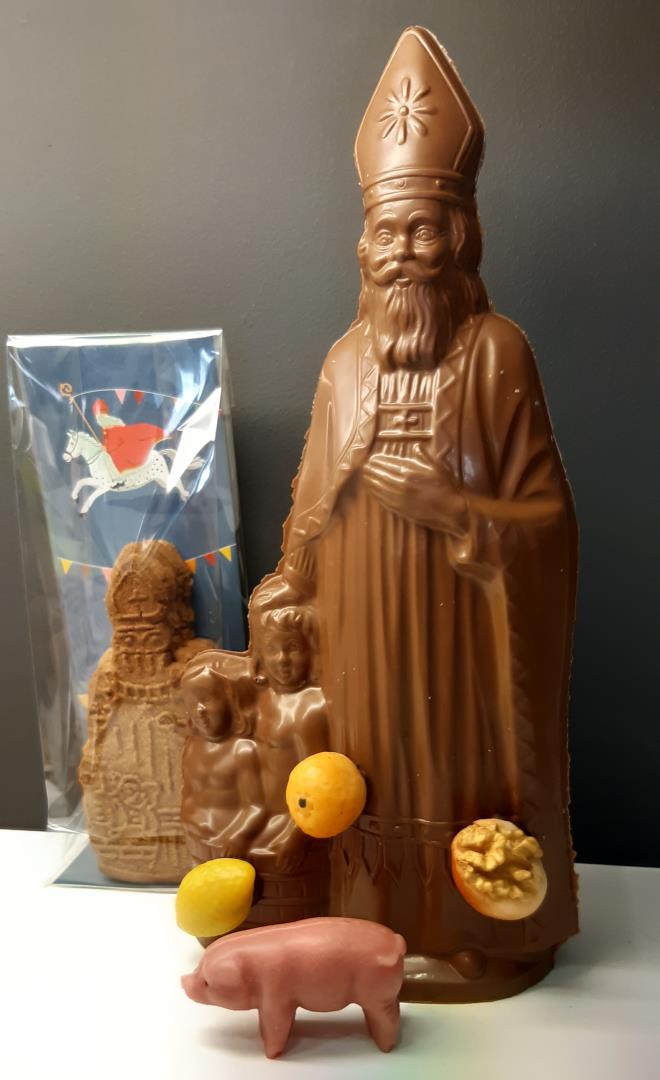 Sinterklaas pakket groot: Grote chocolade sint van 30 cm hoog en 14 cm breed, zakje met 5 speculaasjes, marsepeine varken van 45g.